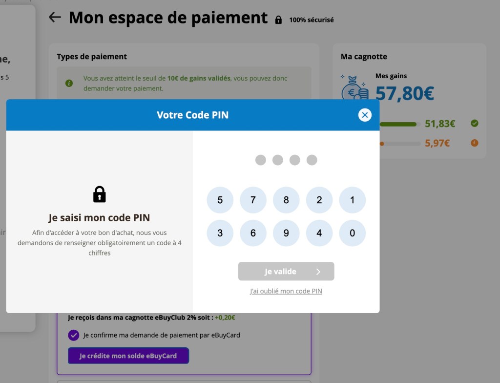 5/ Pour valider le virement, eBuyClub demande le code PIN à 4 chiffres que nous avons créé lors de l’ouverture de notre compte.