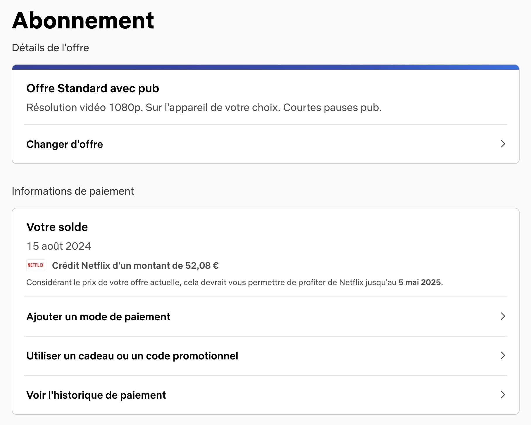J’ai déjà testé, cela marche OK. Le montant de mon « crédit » est enregistré sur mon compte Netflix et est débité au fil des mois.