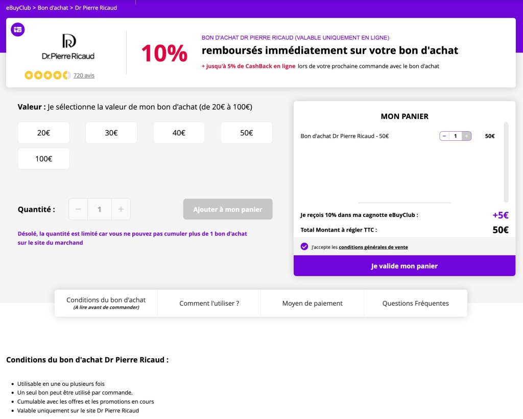 J’ai vérifié sur eBuyClub, nous pouvons commander des bons d’achats de différentes valeurs : 20€, 30€, 40€, 50€ ou 100€ (à ce jour).